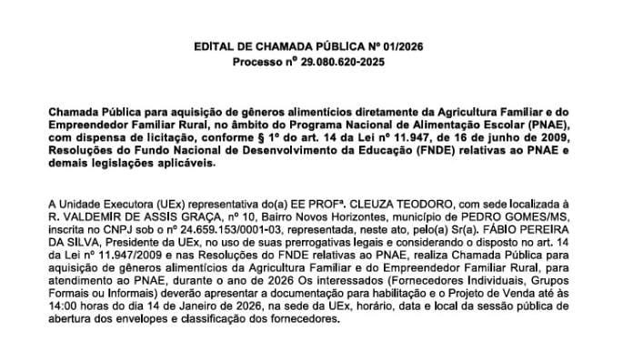 A Unidade Executora (UEx) da Escola Professora Cleuza Teodoro realiza uma chamada pública nº 01/2026 para a aquisição de gêneros alimentícios oriundos da Agricultura Familiar e do Empreendedor Familiar Rural que serão utilizados na merenda escolar, através do Programa Nacional de Merenda Escolar.