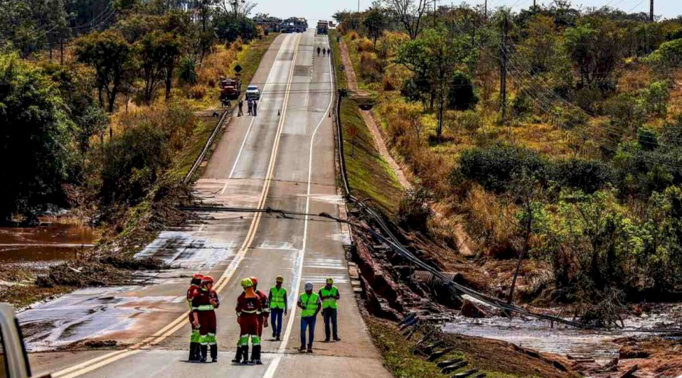 A rodovia foi interditada após a enxurrada da água da barragem rompida invadir a pista.