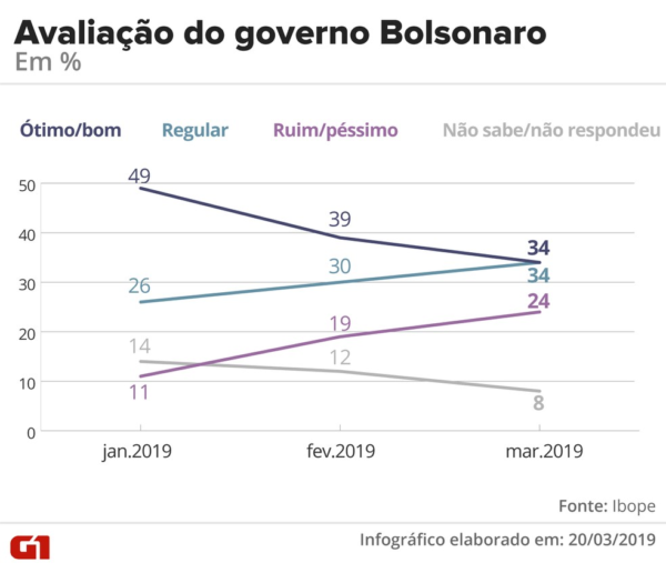 Byadminmarço 21, 2019Índice de aprovação é inferior ao de FHC, Lula e Dilma no mesmo período do primeiro mandato. Reprovação do governo subiu de 11%...