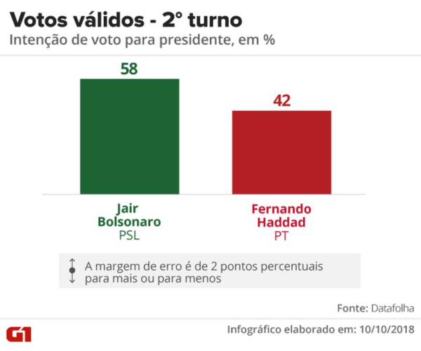 Byadminoutubro 11, 2018Nos votos totais, Jair Bolsonaro, do PSL, tem 49%, e Haddad, 36%. Pesquisa é a primeira do instituto no segundo turno das eleições....