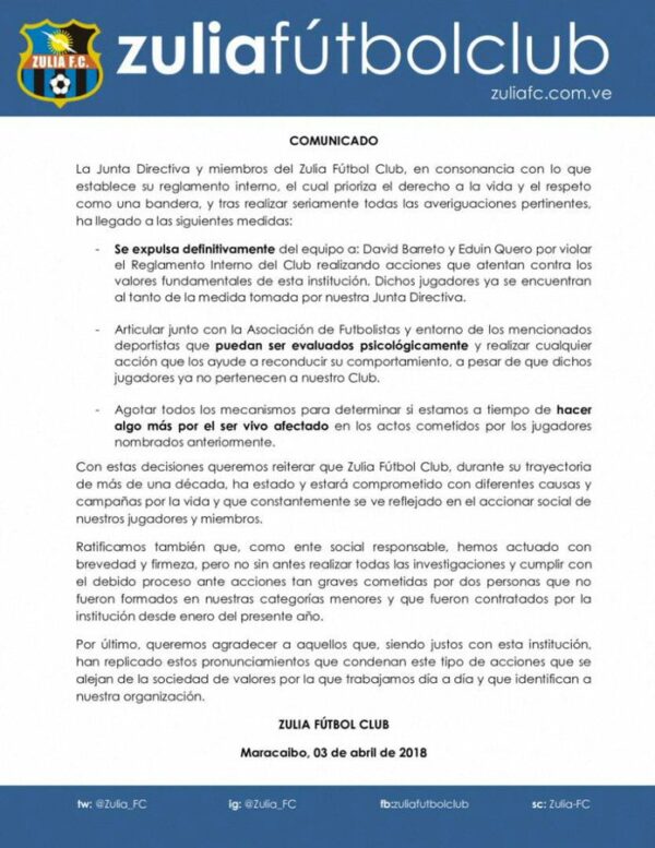 Byadminabril 4, 2018Metrojornal Dois jogadores foram expulsos do Zulia FC, time da Venezuela, por maus tratos ao um gato. Imagens nas redes sociais mostram David...