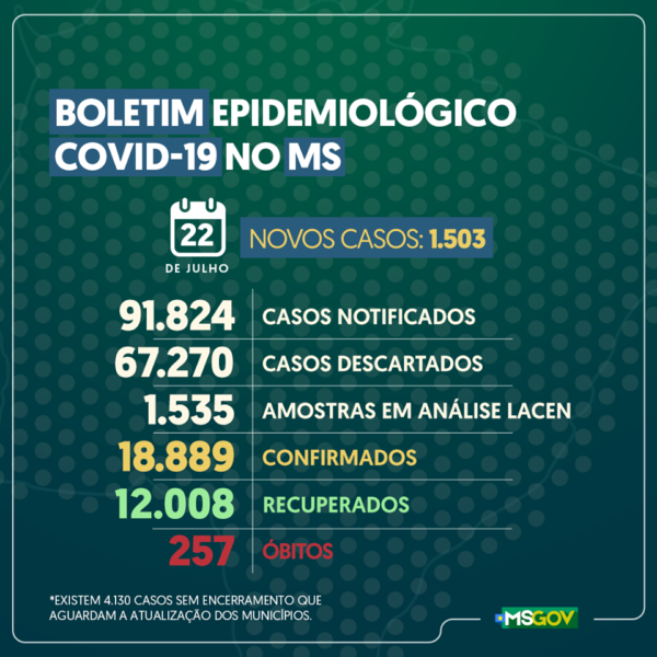 Byadminjulho 22, 2020Dos 9 óbitos registrados em 24h, 6 pessoas eram de Campo Grande. Em apenas 24 horas, Mato Grosso do Sul registrou 1.503 exames...