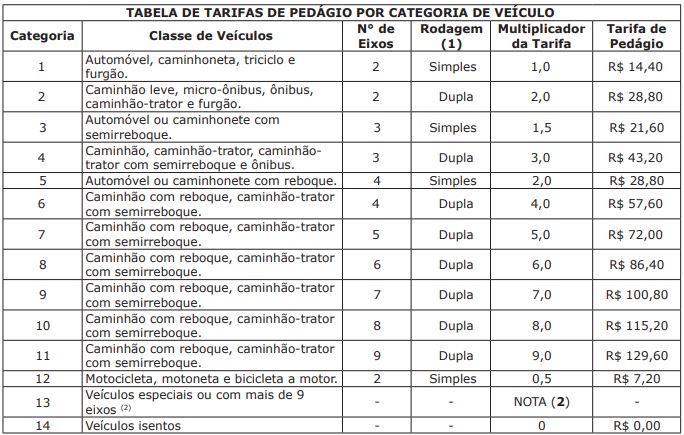 Em consequência, a tarifa de pedágio para a categoria 1, que é a de automóveis, caminhoneta, triciclos e furgão, passa de R$ 13,90 para R$ 14,40.