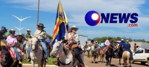 Montados em cavalos, cavaleiros e cavaleiros percorreram o logo percurso até chegarem ao ponto final-, na fazenda Arco Íris.