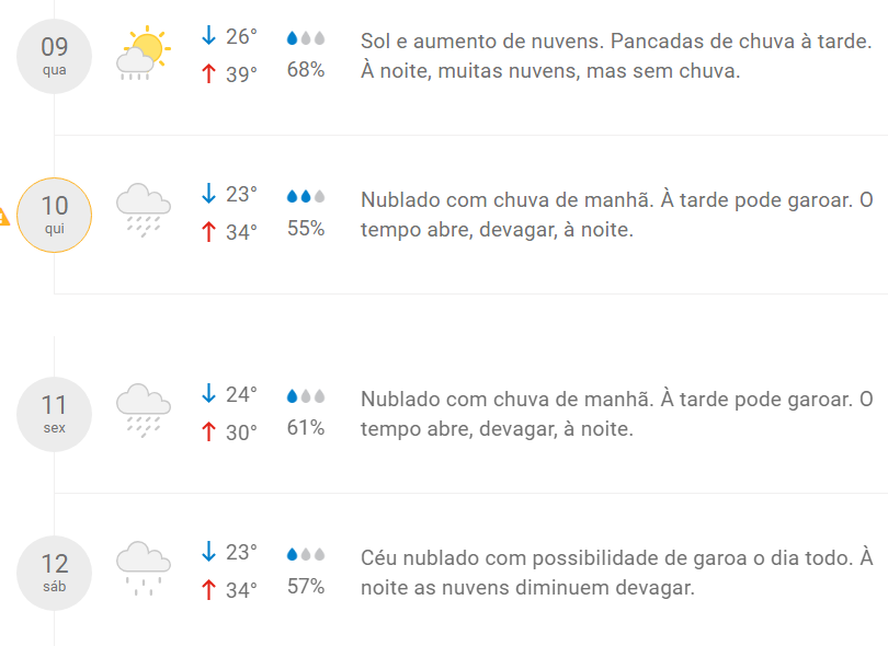 Na quinta-feira (10) volume significativo de chuva poderá cair nos três períodos do dia. São previstos mais de onze milímetros de chuvas. AS temperaturas ficaram mais amenas, entre 23ºC e 34ºC.