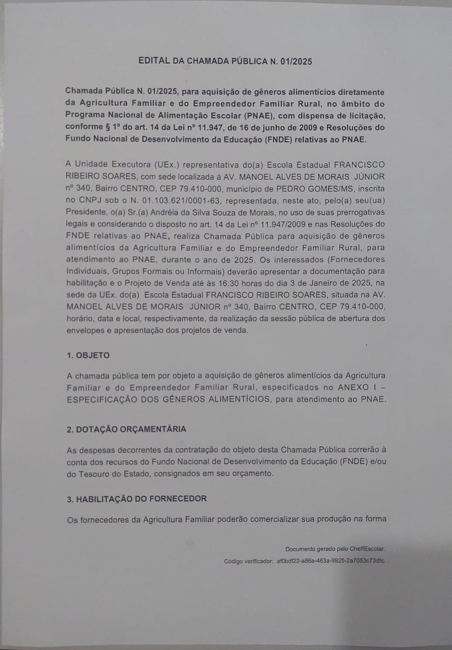 A Unidade Executora, representada pela Escola Estadual Francisco Ribeiro Soares realiza uma Chamada Pública nº 01/2025 para a aquisição de itens utilizados na merenda escolar, através do Programa Nacional de Merenda Escolar. A chamada vale para o 1º semestre de 2025 e vale até o dia 03 de janeiro de 2025 até às 16:30h.