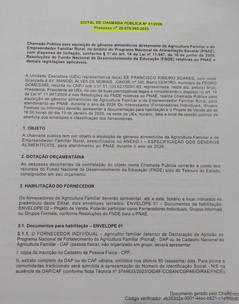 A Unidade Executora, representada pela Escola Estadual Francisco Ribeiro Soares realiza uma Chamada Pública nº 01/2026 para a aquisição de itens utilizados na merenda escolar, através do Programa Nacional de Merenda Escolar. A chamada vale para o 1º semestre de 2026 e vale até o dia 13 de janeiro de 2026 até às 16:h.