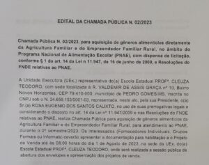 A Unidade Executora (UEx) da Escola Professora Cleuza Teodoro realiza uma chamada pública nº 02/2023 para a aquisição de gêneros alimentícios oriundos da Agricultura Familiar e do Empreendedor Familiar Rural que serão utilizados na merenda escolar, através do Programa Nacional de Merenda Escolar.