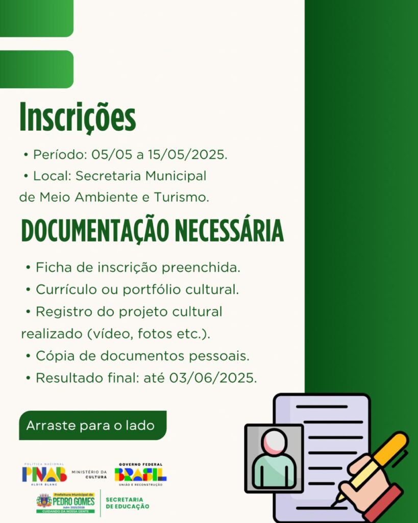 As inscrições estão abertas e irá até o dia 15 de maio na Secretaria de Meio Ambiente e Turismo. Para poder participar, os participantes terão que ter atuação de no mínimo um ano na cidade. As apresentações serão premiadas com valores que variam de R$ 300 até R$ 6.000. Os projetos vencedores serão revelados no dia 03/06/2025. Confira o anúncio: