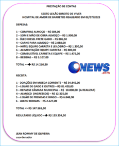 A coordenação do almoço, bingo e leilão para o Hospital do Amor, sob o comando do advogado Dr. Jean Rommy divulgou a prestação de contas do evento que ocorreu no salão paroquial da igreja Católica no centro.