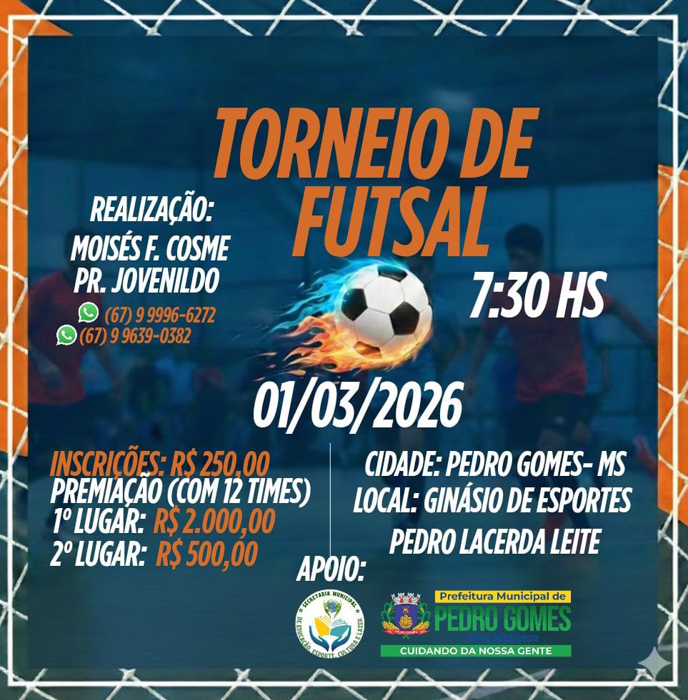 Lar ♦ESPORTES Pedro Gomes: Torneio de Futsal agita cidade pedrogomense no dia 1º de março; inscreva seu time