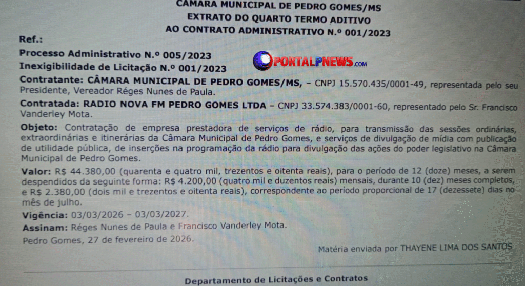 De acordo com o extrato do contrato, os valores são para as transmissões das Sessões Ordinárias, Extraordinária e Itinerária da Câmara Municipal de Pedro Gomes. Além de serviços de divulgação com publicações de utilidade pública.