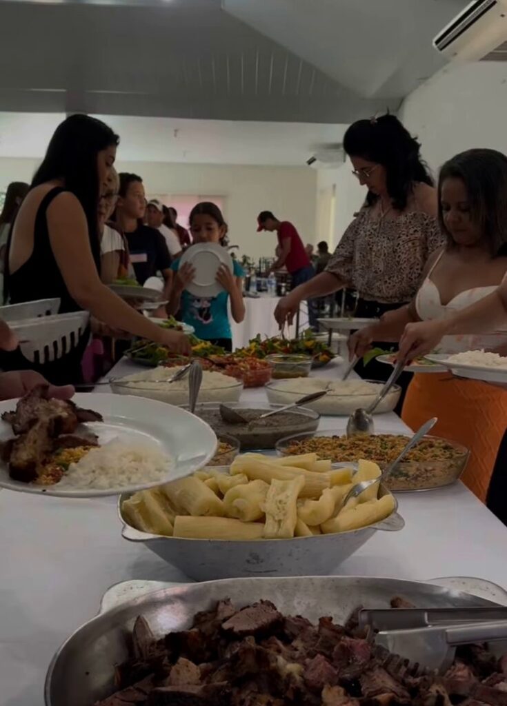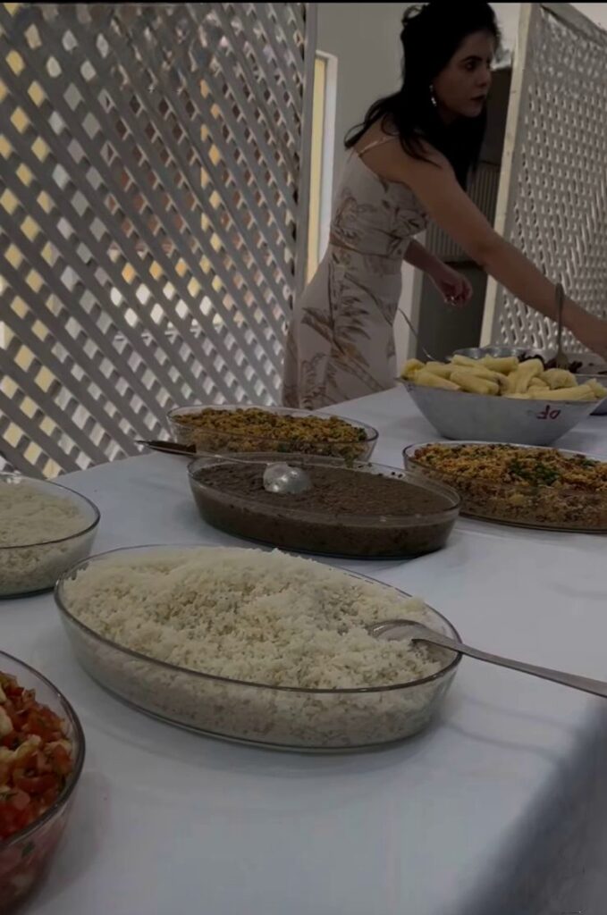 Comeram e beberam desde das 10h da manhã. O cardápio o básico; arroz, salada, empamonado, mandioca e claro-, churrasco. Bebida teve: água com ou sem gás, refrigerantes e chope. Tudo acompanhado de música ao vivo. Reges também presenteou os mais próximos com panetones de marca cara e parecia realizado.