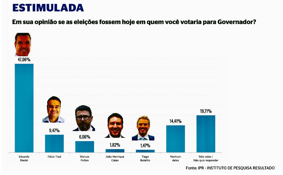 De acordo com o levantamento estimulado, quando são apresentadas aos entrevistados as opções com os nomes dos candidatos, Riedel obteve 47,06% das intenções de votos, enquanto o segundo colocado, o ex-deputado federal Fábio Trad (PT), somou 9,47%.