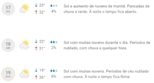 Na sexta-feira (17), Pedro Gomes tem previsão de altas temperaturas, mas com possibilidade de chuva rápida. As pancadas podem ocorrer no período da tarde. Durante à noite o tempo ficará aberto.