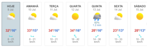 Para está segunda-feira (10), o período da manhã é gelada em torno de 15ºC-, a mínima prevista para o dia. No decorrer do dia casacos serão dispensados, a máxima deve chegar aos 33ºC no início da tarde. A terça-feira (11) mais calor. Tempo firme e abafado. Embora pela manhã são previstos 16ºC, de manhã. O sol aparecerá e a máxima chegará aos 34ºC.