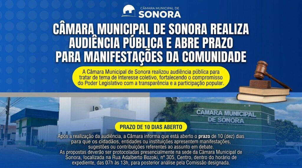 Lar ♦SONORA Sonora: Câmara de Vereadores realiza Audiência Pública e abre prazo para manifestações da comunidade