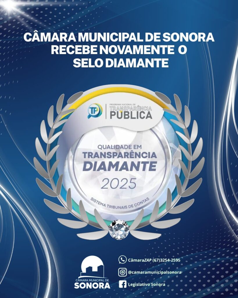 A Câmara Municipal de Sonora alcançou mais uma importante marca na gestão pública: a conquista do Selo Diamante de Transparência no Programa Nacional de Transparência Pública (PNTP), promovido pela Atricon (Associação dos Membros dos Tribunais de Contas do Brasil). A certificação representa o mais alto nível de reconhecimento concedido pela entidade e destaca os órgãos públicos que atingem excelência na oferta de informações à população.