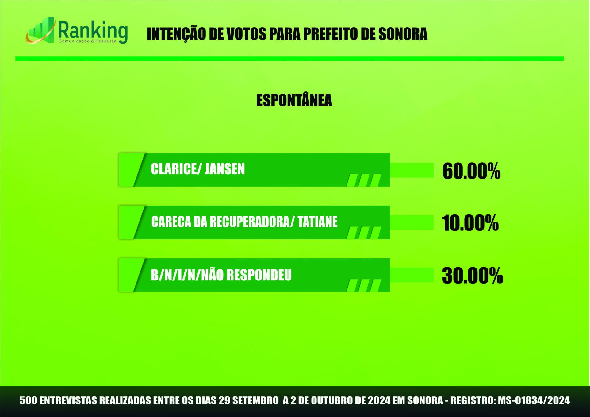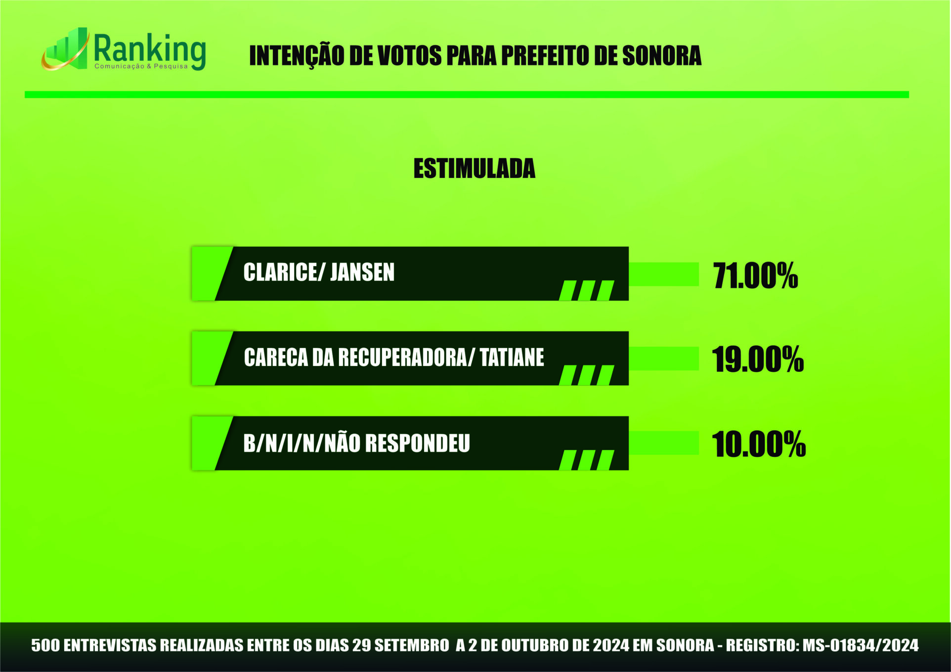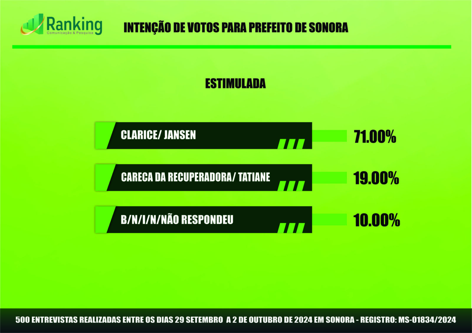 Pesquisa registrada no TSE (Tribunal Superior Eleitoral) sob o nº MS-01834/2024, encomendada pelo CNPJ 03955300000112, o Instituto Ranking Brasil Inteligência realizou, no período de 29 de setembro a 2 de outubro, junto a 500 moradores de Sonora (MS), com 16 anos ou mais de idade, a terceira e última pesquisa de intenção de votos para a Prefeitura Municipal nas eleições 2024, tendo intervalo de confiança de 95% e uma margem de erro de 4,35%, para mais ou para menos.