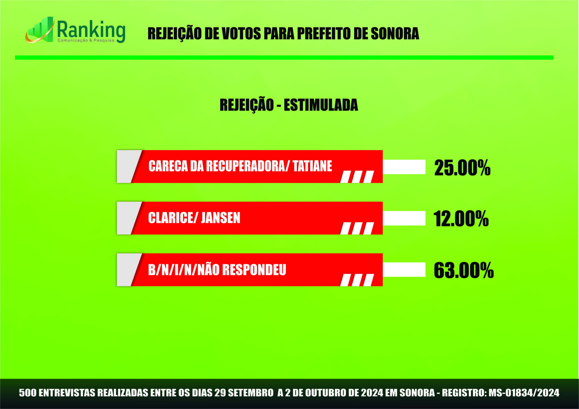 No quesito rejeição estimulada, o Careca da Recuperara lidera, com 25%, sendo que nas pesquisas anteriores os percentuais foram 5% e 15%, respectivamente, enquanto Clarice vem em seguida, com 12%, sendo que nas anteriores os percentuais foram 4% e 10%, respectivamente, enquanto 63% dos entrevistados não sabem ou não responderam, sendo que nas anteriores os percentuais foram 53% e 75%, respectivamente.