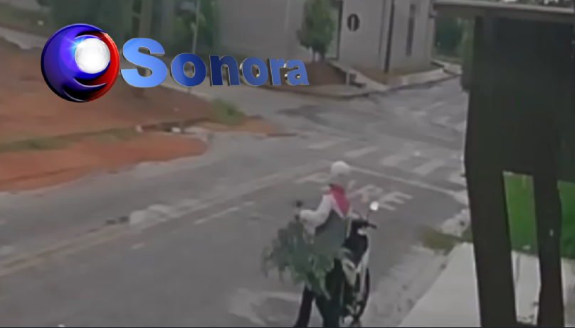 Uma mulher em uma motocicleta foi flagrada furtando uma muda de planta de um canteiro de calçada na cidade de Sonora.