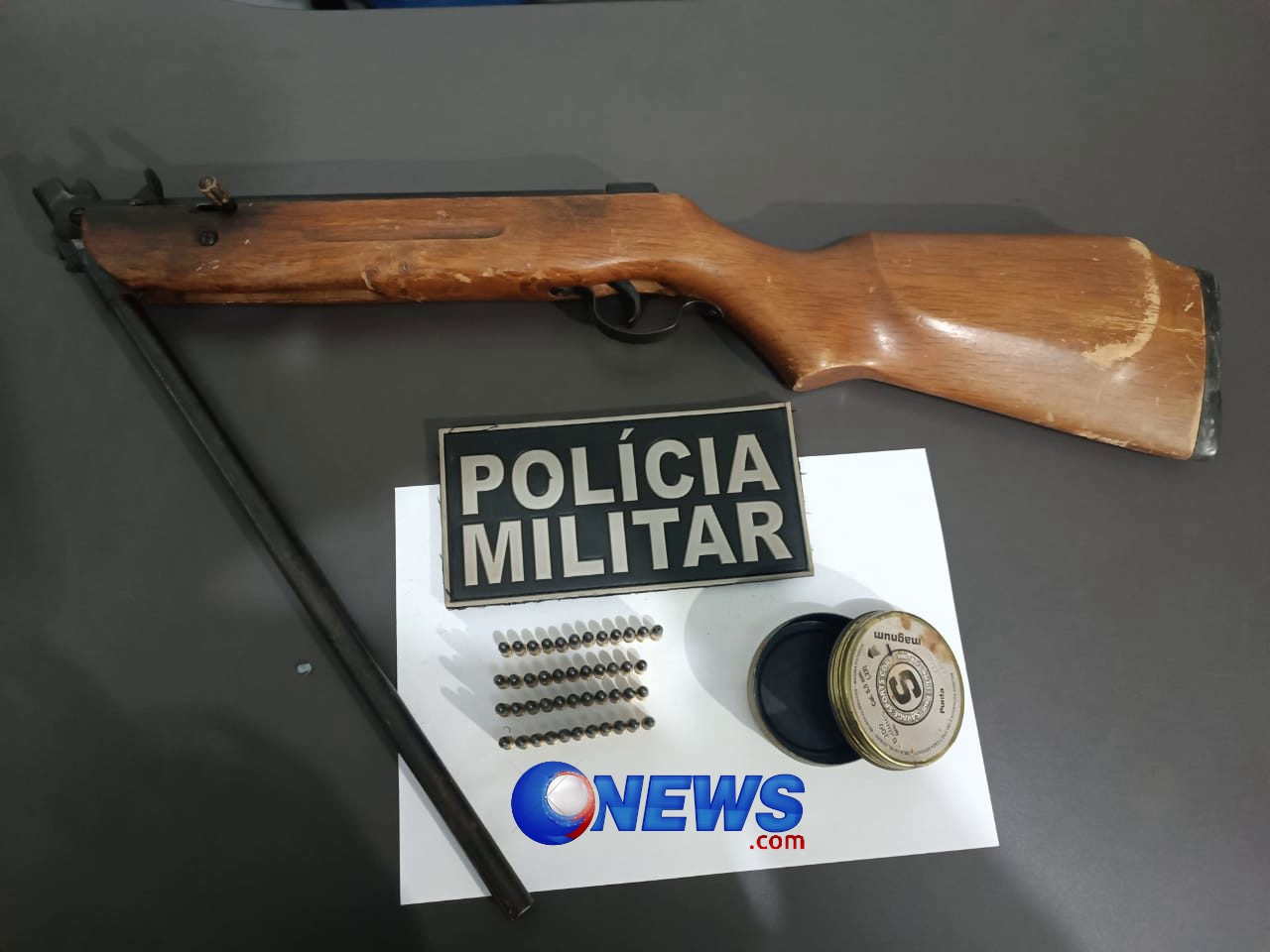 Ao chegar ao local, os militares localizaram o suspeito e, durante a abordagem, apreenderam uma espingarda calibre .22 e 45 munições do mesmo calibre.